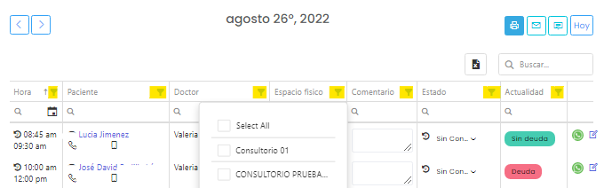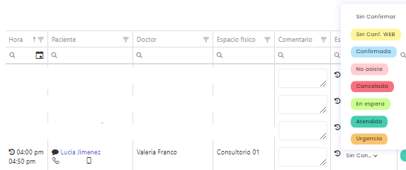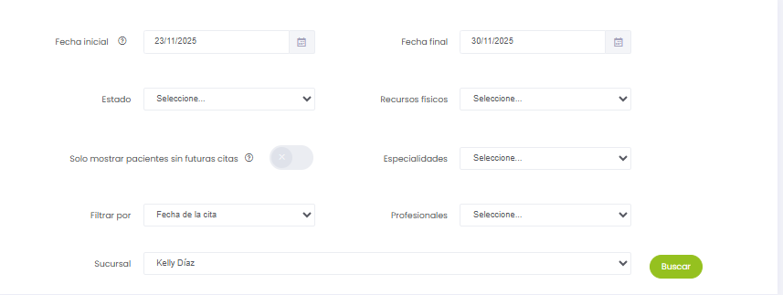 Estado: Si se requiere filtrar las citas marcadas con algún estado en especifico bien sea confirmadas, canceladas, no asistidas, etc..