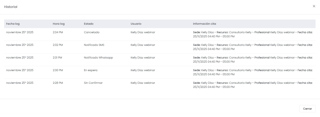una cita desde su programación informando hora, estado y usuario que realizo el