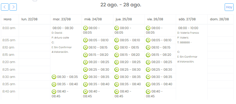 horarios con citas ya asignadas aparecerán con la información de la cita(ver imagen anterior), si la