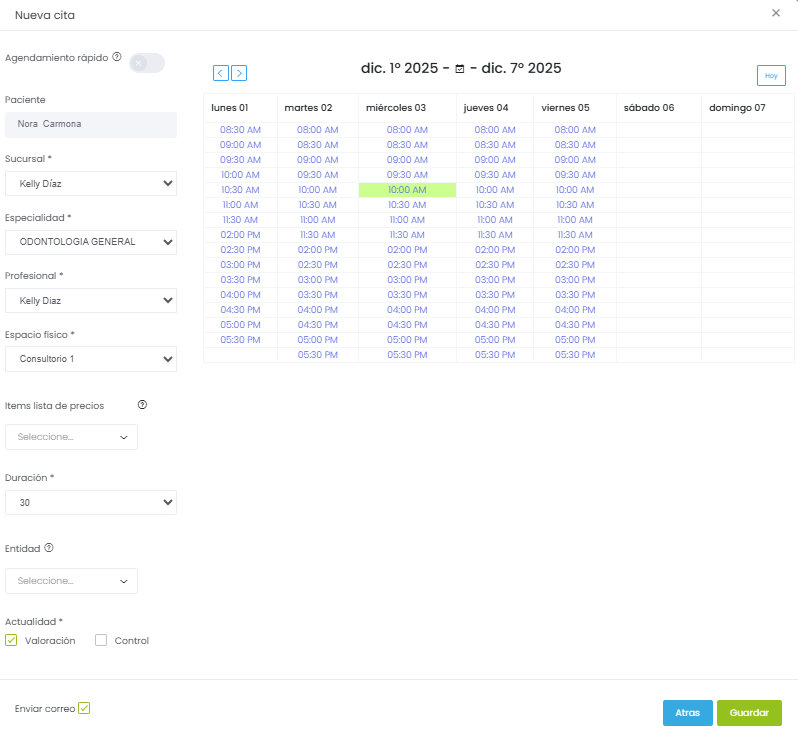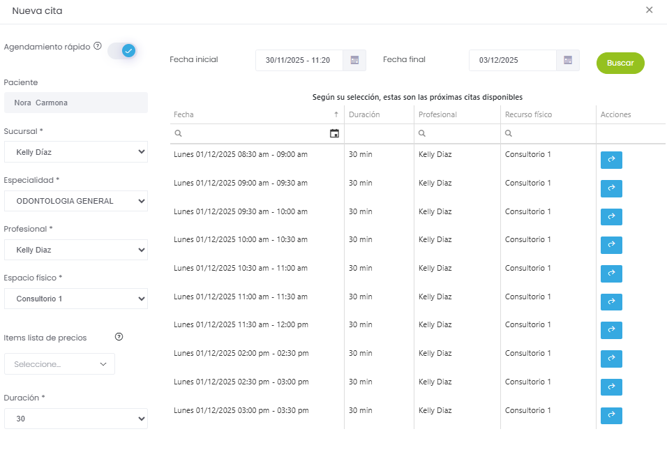"Agendamiento Rápido" Al activar esta opción podrá obtener las 10 citas más cercanas para agendar al paciente, filtrando por el rango de fecha que necesita, fecha inicial y fecha final, completa las opciones del lado izquierdo con * y da clic en buscar, donde le trae la información de esas 10 citas y al seleccionar el espacio, agenda la cita del botón azul del lado derecho en la columna "Acciones"