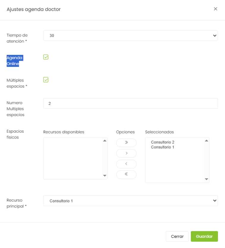 opción Agendamiento Online y configuramos los consultorios en los que va
