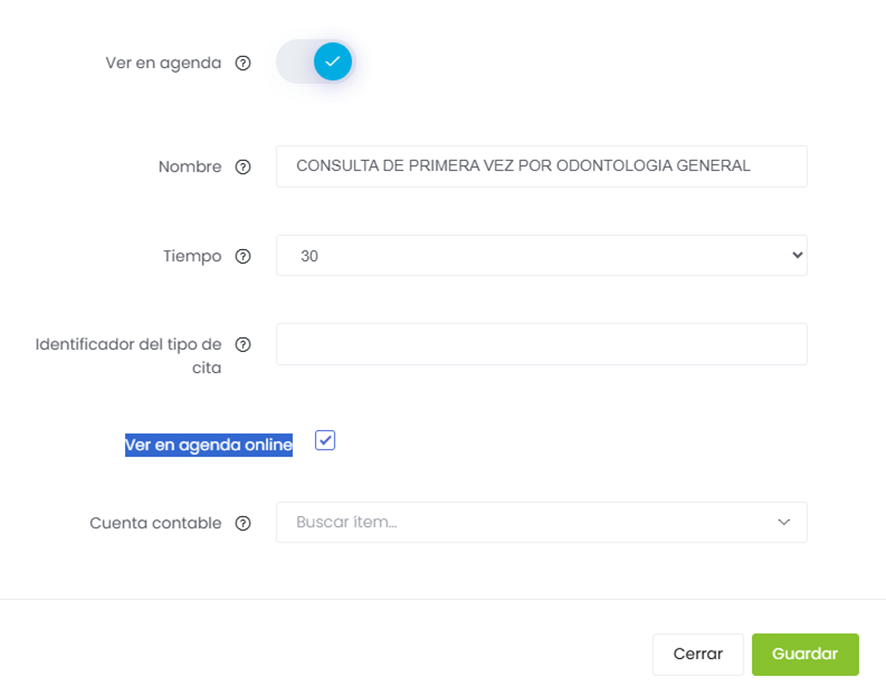 el ítem que desean esté disponible para agendamiento online, ingresando del