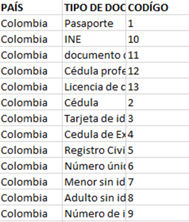 son los campos que se deben diligenciar con los códigos que encontramos en los
