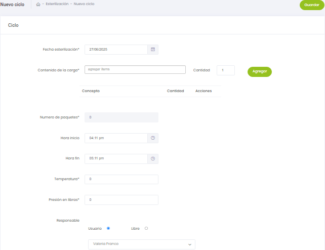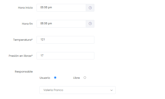 Responsable: persona a cargo de realizar el proceso de esterilización, allí podrás escoger la opción "Usuario" en caso de ser una persona que esta creada dentro del software y podrás seleccionar el usuario, en caso de ser una persona externa no creada dentro del software dar click en la opción "Libre" y escribir manualmente el nombre completo.