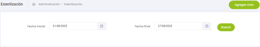 1. Ingresamos al módulo Administración > opción Esterilización, vamos a seleccionar la opción "Agregar ciclo" ubicada en la parte superior derecha en color verde.