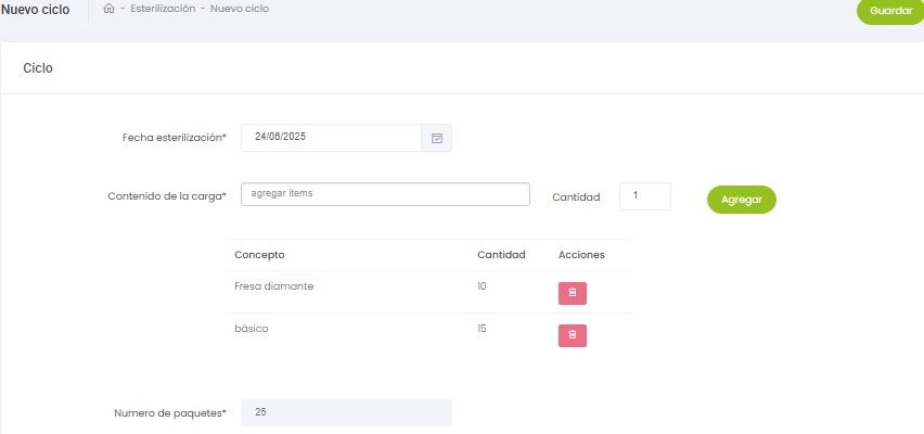 Contenido de la carga: escribe el nombre del insumo o producto que se colocará dentro del equipo de esterilización en esa carga específica. Ejm: Básicos, Fresas diamantadas, entre otros; después all lado derecho del "Contenido de la carga" debes especificar la cantidad a esterilizar por insumo y dar click en "Agregar" puedes agregar uno o varios items siempre y cuando sean los que vayas a esterilizar en esa carga.