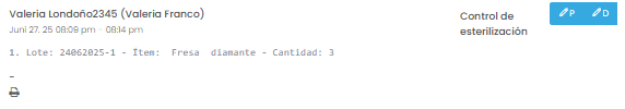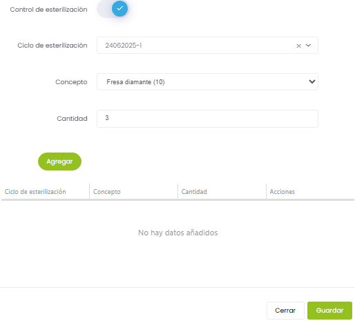 Fecha de esterilización: se refiere al día en que el insumo/producto fue sometido al proceso de esterilización, por defecto el software muestra la fecha actual, sin embargo esta fecha es modificable, ten en cuenta que si la modificas al generar un reporte de esterilización aparecerán ambas fechas, la fecha real de creación y la fecha de esterilización.