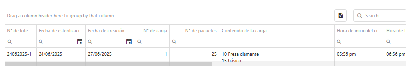 Fecha de creación: fecha real de creación del ciclo de esterilización, como pueden observar en la imagen la fecha de creación del ciclo de esterilización fue el 27/06/2025 pero cuando cree el ciclo yo modifique la fecha de esterilización por el 24/06/2025 y en el informe se reflejan ambas fechas.