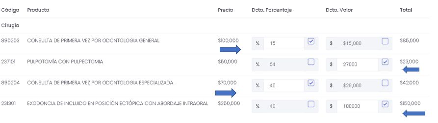 Una vez diligenciamos la información solicitada, daremos clic en el botón azul "Continuar" y procedemos a aplicar los descuentos por porcentaje o valor a cada procedimiento de la lista de precio que seleccionamos.