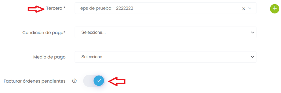 3. Seleccionar el tercero (Entidad), diligenciar los campos "Medio de pago" y "Condición de pago" y activar el Flag “Facturar ordenes pendientes”.