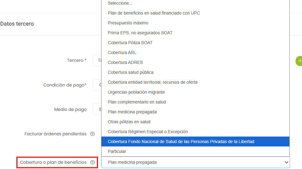 4. En el campo de Cobertura o plan de beneficios se debe escoger el plan de beneficios que corresponda al paciente o pacientes a facturar a la entidad, este debe ir a corde al tipo de vinculación previamente escogido en el historia del paciente opción "Eps".