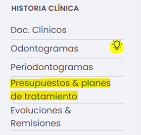 “presupuestos y planes de tratamiento” ubicada en el menú de opciones del lateral izquierdo.