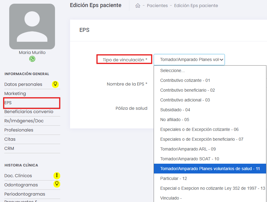 Antes de crear el plan de tratamiento, debemos dirigirnos a la opción eps del paciente ubicada de lado superior izquierdo, en esta debemos escoger el tipo de vinculación que aplique según la entidad a la cual se va a facturar, este tipo de vinculación es muy importante a la hora de hacer la factura a la entidad correspondiente: