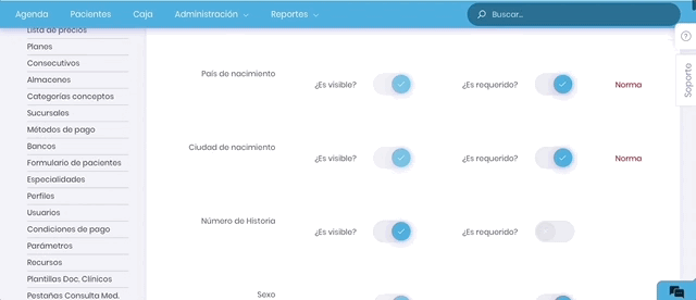En la parte de Configuración -> Formulario paciente los campos que tienen Norma son obligatorios para la seccional de salud y no se recomienda desmarcar