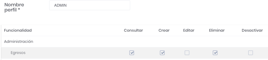 Para este ejemplo vemos el perfil ADMIN, que va ser usado por los usuarios administrativos del sistema. Los usuarios que están asociados al perfil ADMIN tienen permiso para consultar egresos, crear y eliminarlos pero no para editarlos ni desactivarlos.