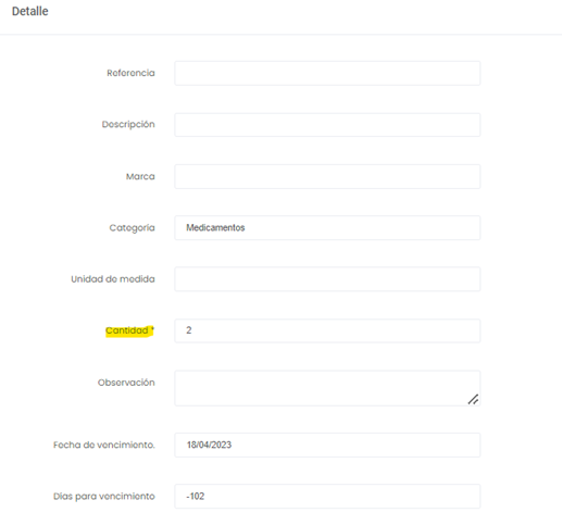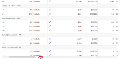 los campos de la tabla para especificar el stock actual, stock mínimo, stock