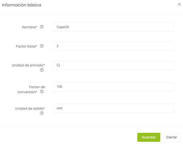 Factor Base: Este número representa para este factor de conversión el número con el cual se recibirá las unidades de entrada (2 cajas, 1 bolsa, 3 paquetes) solo permite ingresar valores numéricos.