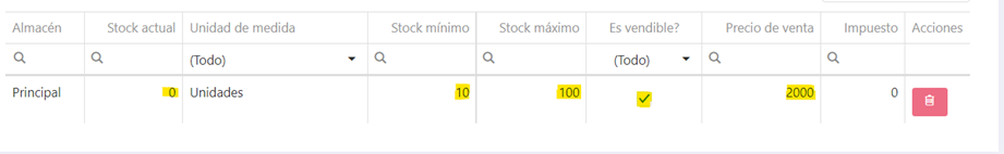 máximo, indicar si el producto es vendible, indicar el precio de venta y si se