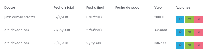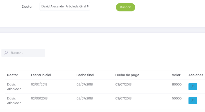 - Pagadas: Muestra el listado de liquidaciones pagadas en un rango de fechas, éstas se pueden filtrar por doctor.