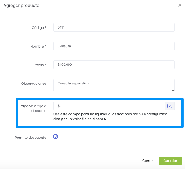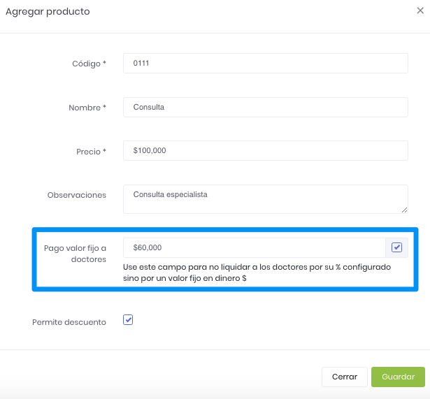 - Desde la creación de los ítems en la lista de precios se puede marcar para que el ítem no se pague a los doctores por su % configurado en el usuario sino un valor fijo.
