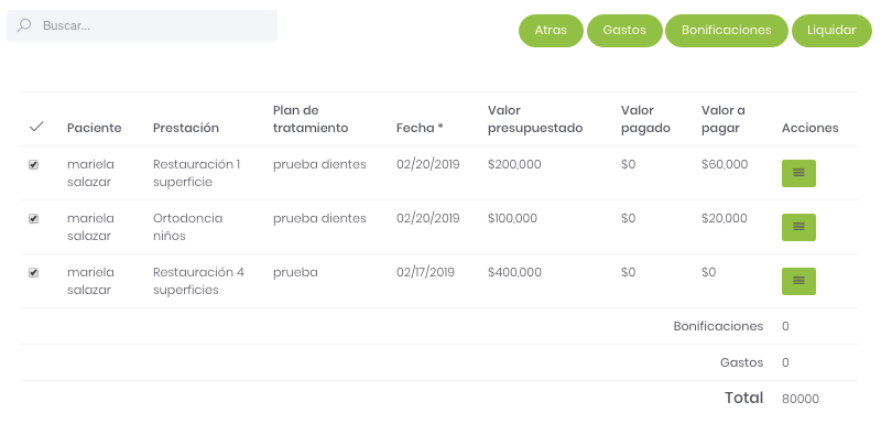- Pendientes: Aquí podemos ver los ítems que le debemos liquidar al doctor en el periodo de tiempo seleccionado. Usando el Botón de Gastos podemos adicionar gastos de laboratorio u otros antes del cálculo. Con el de Bonificaciones, podemos agregar valores adicionales, después del cálculo del valor.