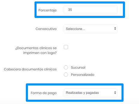 Se asigna el porcentaje desde Configuración- Usuarios. Una vez allí, si el usuario es un doctor se puede agregar el % y le indicamos al sistema si deseamos liquidar al doctor cada que este realice un Ítem, y si debe estar Realizado y además pagado por el cliente.