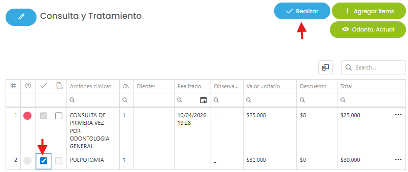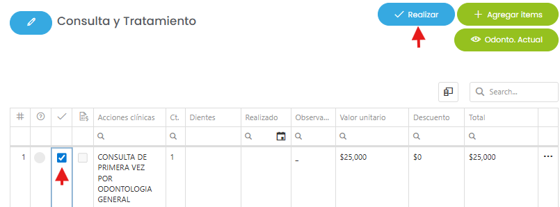4. Ahora vamos a sincronizar la consulta previamente creada con el plan de tratamiento, ingresamos a “Presupuestos y Planes de tratamiento” > opción "Nuevo plan de tratamiento" colocamos un nombre y damos clic en "Crear" agregamos al plan de tratamiento el item de consulta que se creo en la lista de precios clínicos, recordemos que debe ser el mismo código CUPS que se agregó en la plantilla de diagnóstico en la consulta del paso anterior, una vez agregado el item de consulta damos clic en la casilla que se muestra en la imagen y seleccionamos la opción "Realizar" .