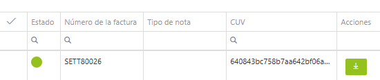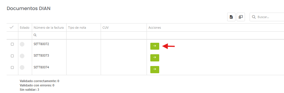 3. Los obligados a facturar deberán hacer el envió por factura emitida desde el archivo "Documentos DIAN", seleccionando el botón verde de la columna "Acciones" en el número de factura que desee enviar, puede hacerlo de a una o escoger varias desde la casilla ubicada en la primera columna, en caso de que desee enviar de forma masiva puede presionar el botón "Enviar" de la parte superior derecha o "Exportar" si desea descargar la información.