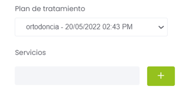 2. Procedemos a seleccionar el “Plan de tratamiento” luego Hacemos clic en el botón verde que aparecerá en el campo “Servicios”.