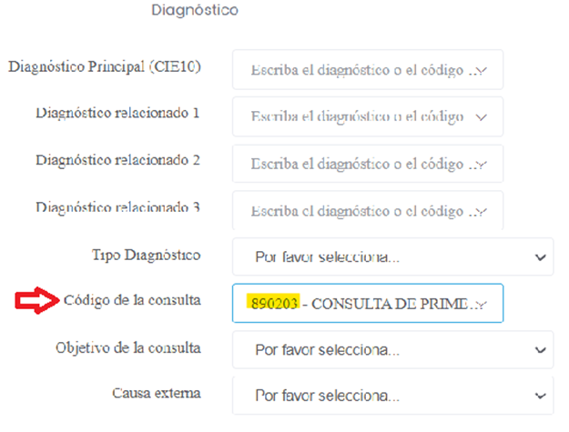 3. En la plantilla de diagnóstico diligenciar todos los campos (Diligenciar los diagnósticos relacionados 1,2,3 en caso de que aplique de lo contrario se pueden dejar en blanco). En el campo “Código de la consulta” debe ir el mismo código CUPS de consulta que se agregó o se va agregar en el plan de tratamiento.