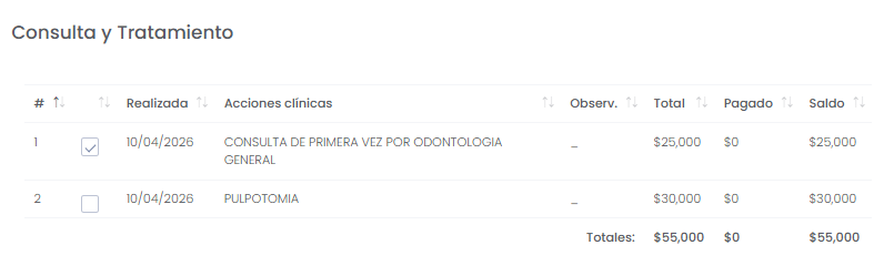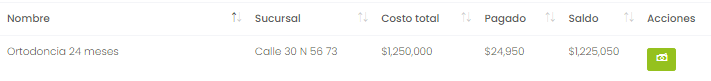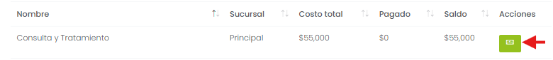 2. Allí visualizaremos todos los planes de tratamiento que estén pendientes por pago, seleccionamos el plan de tratamiento que se desea facturar desde el icono verde ubicado en la columna acciones