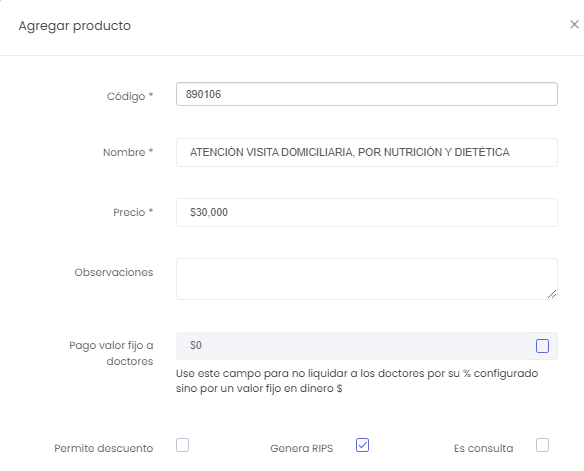 En resumen los campos Código, Nombre, Genera RIPS y Es consulta (en los casos que aplique) son los campos fundamentales para que los items que se creen generen RIPS.
