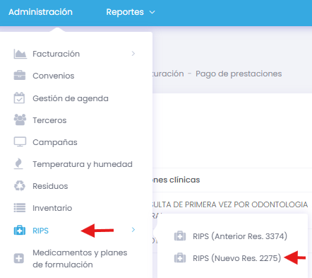 1. Ingrese al módulo "Administración" > opción "RIPS" > RIPS(Nuevo Res. 2275)