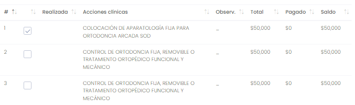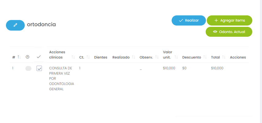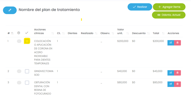 1. Se debe tener creado el plan de tratamiento y agregados los ítems para poder realizar la evolución. Una vez creado el plan de tratamiento y agregados los ítems se debe marcar la casilla ubicada en la parte posterior izquierda del procedimiento al cual se le va a realizar la evolución y luego hacer clic en el botón azul “Realizar”.