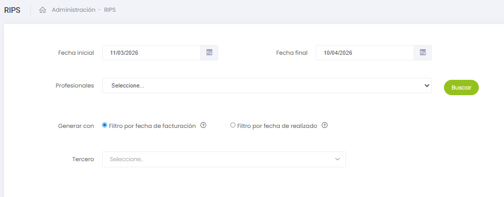 - El sistema permite generar los RIPS por el rango de fecha deseado, seleccionando la fecha inicial y final de preferencia.
