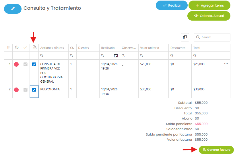 1. Si requiere generar la factura electrónica de venta podrá hacerlo directamente desde el plan de tratamiento, habiendo primero marcado el realizado, puede escoger facturar uno o varios items dando clic en c/u en la casilla de la 4ta columna señalada, después selecciona la opción "Generar factura"