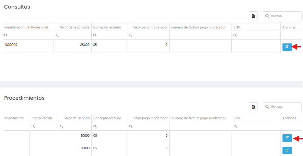 4. Quienes NO estén obligados a facturar podrán también hacer el envió masivo desde el botón "Enviar" o seleccionar las prestaciones que deseen enviar directamente desde el archivo de consultas y/o procedimientos desplazando la barra de la tabla hacia la derecha y presionando el botón azul ubicado en la columna "Acciones" así: