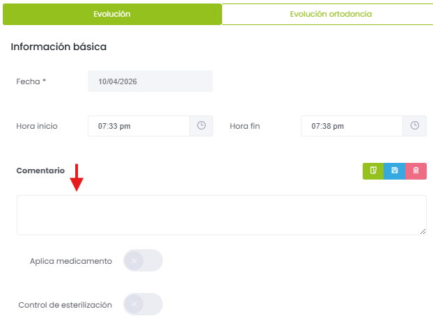 2. Al hacer clic en el botón realizar se abrirá una nueva ventana en el campo “Comentario” añadiremos la información de la evolución según criterio médico.