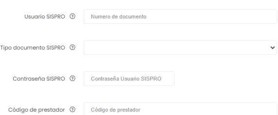 3. Después de activar la casilla se desplegara los siguientes datos: Usuario SISPRO, tipo documento SISPRO, contraseña SISPRO y Código de prestador, por favor diligencie en usuario y contraseña SISPRO las credenciales con las que accede al portal del ministerio, en tipo de documento con el que se haya registrado ante el ministerio de salud y en código de prestador es el de 10 dígitos llamado "Extra_III:CodigoPrestador" lo puede consultar aquí: https://web.sispro.gov.co/WebPublico/Consultas/ConsultarDetalleReferenciaBasica.aspx?Code=IPSCodHabilitacion
