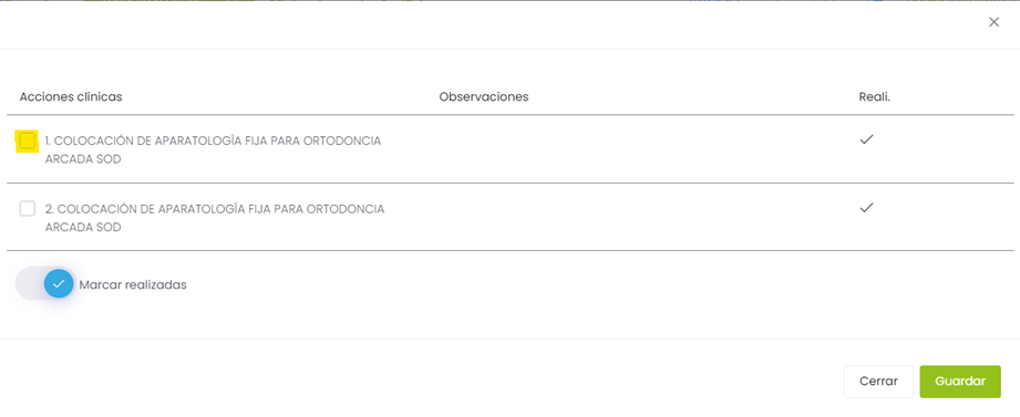 3. Marcar la casilla ubicada en la parte posterior izquierda del procedimiento que se va a evolucionar, encender el Flag “Marcar realizadas”, hacer clic en “Guardar”.
