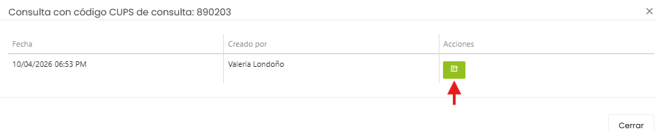 5. Ahora aparecerá esta ventana de abajo, si el código CUPS que ingresamos en la plantilla de diagnostico al diligenciar la consulta, corresponde al código CUPS agregado al plan de tratamiento, el sistema le permitirá asociarlo y marcar como realizado haciendo clic en el botón verde “Asociar consulta médica”.