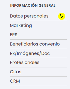 Datos Personales: son los datos básicos del paciente, esta información es lo primero que se diligencia al momento de la creación del paciente, se puede editar o agregar más información en el momento que se requiera siempre y cuando el doctor o doctores estén agregados como doctores del paciente.