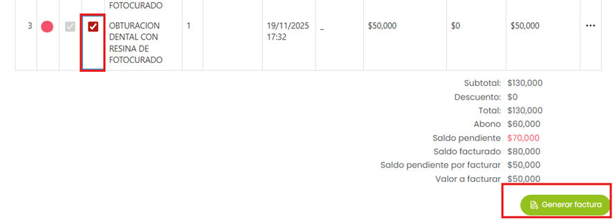 A medida que el doctor va realizando el tratamiento deberá ir seleccionando cada item (procedimiento o consulta) que haya realizado, seleccionando el item y la opción "Realizar" (opción en color azul ubicada en la parte superior derecha).